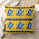 Et un "Bonjour" brillant, ensoleillé pour vous ! C'est le message que vous recevrez lorsque vous parcourez somnolemment le salon pour aller à la cuisine et fixez vos yeux sur cet oreiller extra moelleux, extra moelleux, extra joyeux et très joyeux avec Leslie Sigal Javorek vitrail original bleu et blanc étoile de David; en 2 rangées de 3 étoiles séparées par des bandes d'un motif à clé gris argenté sur le noir & set sur un taxi jaune vif arrière - plan. Sur le dos est le même jaune en lui-même.