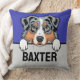 Un berger australien personnalisé jette un oreiller pour les amoureux de les chiens, avec un mignon chien australien qui regarde sur une corniche et une zone de texte personnalisée où vous pouvez taper le nom de votre chien ou tout autre texte. Un cadeau amusant et personnalisable pour n'importe quelle maman de chien berger australien, père, dresseur ou amoureux des chiens.