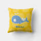 Baleine bleue stylisée de dessin animé mignon sur un fond jaune vif avec de gros pois, décoration de nurserie Coussin personnalisé avec le nom de l'enfant.