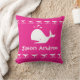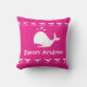 Une partie de la décoration côtière de la plage de l'océan. Baleine blanche sur un coussin rose. Baby girl Nautical Date et nom de naissance coussin personnalisé personnalisé. Design par Sandy Closs.