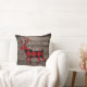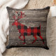 Un cabine de bois d'hiver à thème lancer l'oreiller avec un arrière - plan de la grange de bois récupéré avec un renne de cerf à motif de buffle rouge sous un léger poussif de neige. L'arrière comporte un petit motif de répétition du même grand cerf.