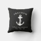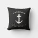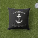 Un coussin extérieur moderne sur le thème nautique pour votre bateau qui présente une illustration blanche d'une ancre sur un arrière - plan noir. Personnalisez avec le nom de votre bateau, une ligne de texte pour le nom du capitaine ou de la famille ou quelque chose de similaire, et un emplacement.