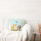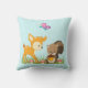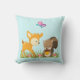 Un coussin avec une jolie illustration montrant un cerf de bébé et un petit écureuil tenant une glande et un papillon volant au-dessus de leur tête. Ces adorables créatures boisées se tiennent debout sur une herbe avec quelques champignons fantaisistes à leurs pieds. Arrière - plan bleu clair.