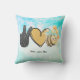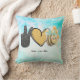 Jetez un oreiller mignon avec le texte "Peace Love Bees", symbole de la main de paix noir brillant, coeur doodle or et abeille lunaire sur un arrière - plan de nuages d'aquarelle.