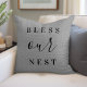 Ferme moderne Bless Our Nest jetez l'oreiller. Veuillez noter que la texture arrière - plan subtile du burlap fait partie du design imprimé et que le produit n'est pas fait de tissu de burlap réel. Cliquez sur le bouton Customiser pour ajouter votre propre texte et sélectionnez parmi tous nos styles de coussin pour créer votre propre design unique d'un genre !
