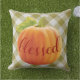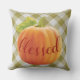 Joli coussin extérieur avec un design citrouille de l'automne orange sur un arrière - plan blanc et vert en vichy antique plaid, et mignonne remerciant "Heureux" citation de texte. Whimsical Thanksgiving décor de vacances accent pour décorer la véranda avant ou arrière, patio ou véranda de votre maison de ferme style cottage de campagne décoré, cabine en rondins, maison de lac rustique ou retraite fluviale confortable.