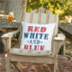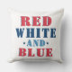 Le design coussin élégant du 4 juillet présente un design typographique "Rouge Blanc et Bleu" dans des couleurs rouge, blanc, bleu, bleu marine avec des accents d'étoile. Un bleu marine coordonné avec un motif étoilé blanc apparaît à l'arrière.