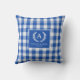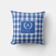 Coussin décoratif à motif Gingham bleu élégant et rustique avec blason monogramme.