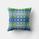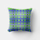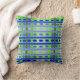 Cet oreiller de lancer a un design géométrique de lignes dans les tons bleu et vert tissé pour faire un plaid.