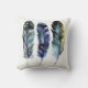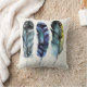 Cet oreiller à deux côtés présente des illustrations d'aquarelle de plumes d'oiseaux dans un style boho, dans des couleurs riches et vibrantes, dressées contre un arrière - plan crème clair. Il y a quatre plumes d'un côté et trois de l'autre.
