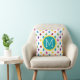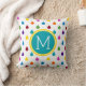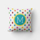 Ce coussin mignon est doté d'un motif de pluie aux tons rouge, orange, jaune, vert, bleu, violet, rose et turquoise sur blanc. Personnalisez le monogramme turquoise et jaune correspondant avec votre choix d'origine.