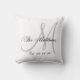 Oreiller personnalisé gris et blanc avec le nom de famille et la date de mariage dans un design de superposition de police de caractères sur fond blanc. Elke Clarke© Disponible sur www.zazzle.com/monogramgallery. Cadeau idéal pour les jeunes mariés ou une famille. Accessoire tendance et élégant pour votre chambre, fauteuil préféré, décoration amusante pour votre salle familiale ou ajout décoratif formel à votre salon. D'autres styles et couleurs sont disponibles dans notre boutique.