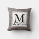 Arrière - plan à motifs herringbone brun et blanc foncé. Le centre dispose d'un cadre de carré décoratif blanc avec une lettre en monogramme noir et le nom de famille complet sous. L'avant et l'arrière sont les mêmes. Egalement disponible sur des coussins lombaires.
