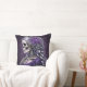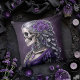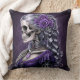 Cameo crânien femelle dans l'oreiller à lancer violet. © Dark Heart Desires. Un oreiller gothique jeté dans le violet avec un caméo d'un squelette femelle aux cheveux argentés orné de bijoux et de roses.