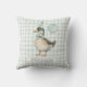 Ce coussin décoratif rétro inspiré présente un canard adorable habillé d'un chapeau de fête et d'un nœud papillon, tenant un ballon fantaisiste. Le fond à carreaux vert sauge doux ajoute un look rustique et cosy.