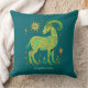 Coussin dans une représentation stylisée d'une chèvre, richement décorée de motifs verts et jaunes, représentant le signe zodiaque Capricorn. Les éléments environnants comprennent des symboles célestes et des motifs feuillus.