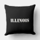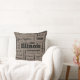 Un coussin avec du charme comportant le nom d'état de l'Illinois et certaines de ses villes et villes en texte noir des polices variables et tailles sur un arrière - plan de taupe. Le dos est noir solide avec le mot le "Illinois" dans le blanc. Renversez juste le coussin pour changer rapidement le regard de votre pièce.