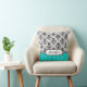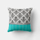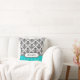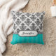 Le motif noir et blanc élégant de damassé a conçu par Liz Molnar sur le coussin avec le ruban argenté, l'étiquette, le texte personnalisable et les rayures pâles sur l'arrière - plan de turquoise.