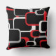 Un design de carrés d'inspiration rétro fait en rouge, blanc et gris contre un arrière - plan noir sur un coussin de lancer.