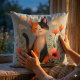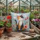 Coussin Chat Calico souriant dans le jardin fleuri