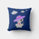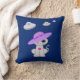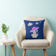 Coussin décoratif avec chat mignon et soucoupes volantes uniquement sur le devant sur fond de couleur bleu royal.