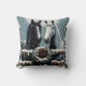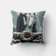 Joli oreiller de Noël avec les graphismes d'un cheval blanc et d'un cheval noir debout à une porte en bois décorée de lampes de Noël de vacances et jolies lumières scintillantes recouvertes de neige. Ces chevaux sont faits dans un dessin humoristique de style pop art pour évoquer un sentiment nostalgique.