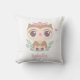 Une chouette bébé mignonne avec un nœud à pois rose est assise sur un carré avec diverses fleurs. Motif à pois de l'autre côté de l'oreiller. Personnalisez avec le nom dans le modèle de texte fourni. Parfait pour décorer une nurserie de bébé fille ou la chambre d'une fille !