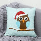 Ce magnifique oreiller à jetons présente une adorable illustration vectorielle d'une chouette brune et bleue portant un casquette du Père Noël perché sur une branche d'arbre sur un arrière - plan enneigé. Parfait pour décorer n'importe quelle chambre pour les vacances d'hiver !