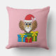 Illustration d'une chouette chouette du Père Noël avec chapeau de santa rouge et cadeaux verts, rouges, bleus avec ruban jaune. Cet adorable oiseau aux yeux grands avec longue barbe et moustache est prêt à célébrer son Noël magique. Et toi ? Vos cadeaux sont-ils prêts ?