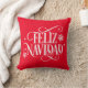 This Christmas throw pillow is shown with festive holiday Feliz Navidad snowflakes print.