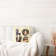 Racontez votre histoire d'amour : Coussin personnalisé en forme de collage photo avec le mot LOVE de couleur jaune chamois pour une Saint-Valentin qu'ils garderont en mémoire.