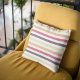 Cet oreiller de lancer présente des rayures horizontales colorées dans les couleurs de l'automne : blanc, jaune, orange, rouge et gris foncé.