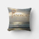 La photo de coucher de soleil de l'Océan Pacifique présentée sur cet oreiller est complétée par le mot paix qui apparaît en or et comporte une lettre P artisanale. La lettre P a été créée à partir de petites coquilles. La couleur solide du coussin arrière peut être customisée et il y a beaucoup de place pour ajouter du texte ou de la photo comme vous le souhaitez.
