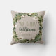Coussin souvenir de mariage personnalisé. Ce coussin au design numérique rustique tendance en lin présente un fond de texture de lin beige naturel avec une belle couronne de verdure à l'aquarelle et de capsules de coton qui encadrent l'élégant monogramme "M. et Mme" en lettrage manuscrit tendance. Le nom de famille marié du couple est écrit dessus, avec la date du mariage en dessous. Le design est le même à l'avant et à l'arrière. Fait un excellent cadeau pour les jeunes mariés. Idéal pour votre chambre, votre fauteuil préféré, un ajout décoratif formel à votre salon ou simplement pour une décoration amusante dans votre salle familiale. Les couleurs de tous les champs de texte peuvent être modifiées comme vous le souhaitez. Copyright Anastasia Designs, tous droits réservés.