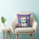 Adorable coussin avec un mignon chat kitty caricaturé blanc, fantaisiste, avec de grands yeux bleus, des oreilles roses et portant un collier brillant et coloré. Elle a une jolie queue rayée bleue, rose et blanche et une bande bleue sur la tête. L'arrière - plan est principalement violet avec des planètes, des nuages, des étoiles et des fleurs dans un mélange de couleurs audacieuses, vives et vives. Idéal pour tous ceux qui aiment les chats et l'espace.