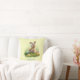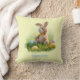 Un mignon lapin de Pâques farci de couleur marron portant un arc jaune est assis dans l'herbe verte entourée d'oeufs de Pâques colorés et décorés.