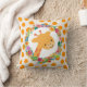 Un coussin avec l'illustration d'un joli visage de girafe souriant, entouré d'une couronne de fleurs tropicales d'aquarelle. Coloré et mignon. Arrière - plan est un motif avec des taches oranges.