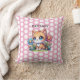 Un adorable chaton assis dans un carré de fleurs bleues et roses et de coussin personnalisé pois blanc.
