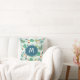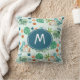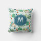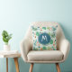 Dinosaur thème lancer oreiller comprend un motif de Tyrannosaurus mignon (T rex), Tricératops, feuilles monstères, palmiers, volcan, os, et "Roar!" texte sur un arrière - plan bleu clair. Personnalisez le monogramme initial dans le centre. Parfait pour la crèche et les salles pour enfants à thème jurassique et préhistorique. Oeuvre originale KL Stock.