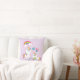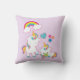 Un coussin avec une licorne de maman blanche avec une crinière et une queue colorées fantaisie. Un bébé licorne posé à côté d'elle, avec une sucette verte dans la bouche. Un arc-en-ciel coloré aux nuages moelleux, et quelques étoiles et coeur décorent ce design doux et adorable. Un contour rose et audacieux entourant l'image lui donne une ambiance de doodle à l'enfant. Arrière - plan de couleur pastel violet clair. Ça aurait l'air adorable dans une chambre pour enfants.