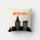 Un carreau orienté de bande dessinée avec une étoile pointillée par jaune a éclaté l'arrière - plan et une silhouette noire de scape de ville. Ajoutez votre propre texte personnalisé pour lui faire vos propres ! Ces coussins décoratifs sont grands dans une chambre à coucher ou une crèche de superhéros, ou grandie une salle de jeu.