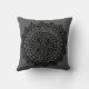 Coussin avec illustration graphique de mandala noir sur fond gris foncé.