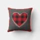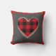 Ce coussin rustique comporte un arrière - plan gris de toile de jute, un coeur de plaid de buffle rouge et noir avec la dentelle vintage de faux autour du bord. Conçu par le ©Tim de renommée mondiale Coffey d'artiste.