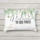Un grand ajout à votre maison, notre coussin à thème porche est orné de feuillage vert et or d'Eucalyptus et de la phrase Bienvenue à notre porte. Revêtement de feuillage vert et or sur le dos.Il n'y aura pas de parties scintillantes sur ce produit.