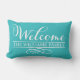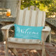 Le design élégant des coussins extérieurs dispose de "Welcome" dans l'écriture moderne en écriture blanche avec le texte de nom de famille personnalisé et l'accent décoratif de défilement. La couleur bleu turquoise de l'arrière - plan que l'on customise à harmoniser avec la décoration.