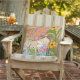Coussin extérieur avec un design amusant, estival, adorable, avec des petites fées de jardin, des champignons, des grenouilles vertes et des fleurs.