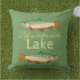 La " vie est meilleur le lac" est imprimée en encre jaune sur une nuance de détente de vert de mousse. Deux images colorées de truite, on faisant face à gauche, on faisant face juste habillent la conception de coussin.