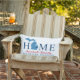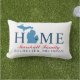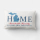 Le coussin de bienvenue élégant comprend du texte "Accueil" avec la carte de l'état du Michigan et du texte personnalisé qui peut être personnalisé avec votre nom de famille et la ville, l'état où vous vivez. Le marqueur de la ville de coeur bleu marine peut être déplacé à l'endroit approprié par l'intermédiaire Customisé. Les bandes horizontales s'habillent à l'envers. Couleurs rouges, blanches, bleues et marines.