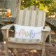 Un coussin de plein air blanc avec une famille écrite dans un script charmant sur votre premier dans la lavande la plus fine. Le mot famille est écrit aux couleurs de l'arc-en-ciel : rouge, orange, jaune, vert, bleu et violet.