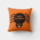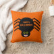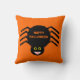 Ce coussin impressionnant présente une araignée noire éffrayante avec huit pattes poilues, des yeux jaunes avec de grands élèves noirs et sa bouche ouverte montrant ses crocs. Il y a un texte orange qui dit "Happy Halloween" et un arrière - plan orange correspondant.